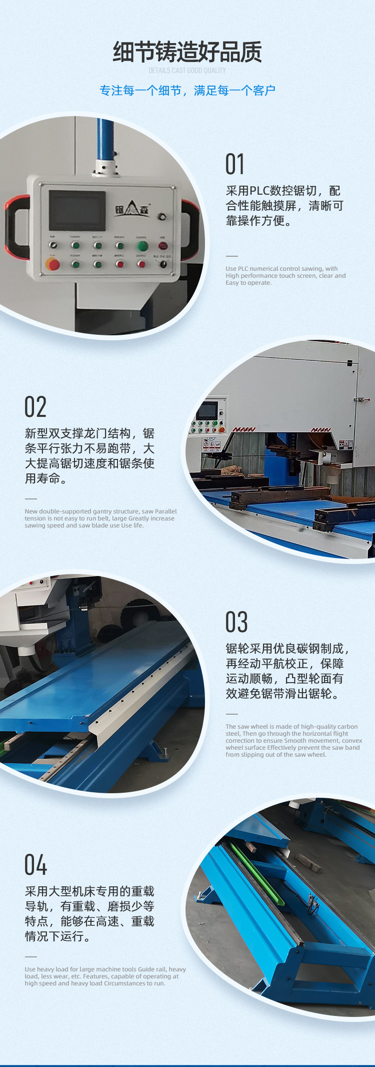 ②:升(shēng)降絲杆:M40×20型号,品(pǐn)牌:德國力士 ③:司(si)服電機:惠川3.7KW/2台(tai) ④:帶鋸輪軸承:SKF,2013型(xing)号/4個,品牌:德國(guo) ⑤:減速機品牌:廣(guǎng)東傑豐 ⑥:PALC品牌:惠(hui)川 ⑦:觸摸屏品牌(pái):7寸,惠川 |